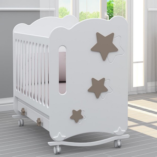 Съвременно и красиво бебешко креватче, чиито заоблени форми, топли пастелни цветове и звездни декорации придават специфично излъчване и уют на детската стая.