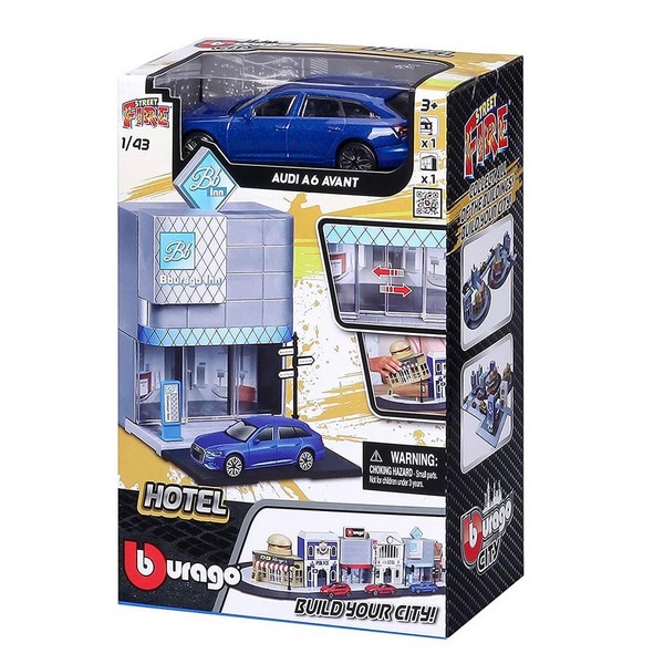 Децата ви имат ли кутии пълни с малки състезателни коли? Ако е така, те могат да получат часове забавление с града Бураго. Винаги ли сте искали да построите свой собствен град? Е, сега е възможно с градските комплекти за игра от поредицата Bburago StreetFire. В допълнение към пластмасовата сграда има включени различни аксесоари. И най -хубавото нещо - Получавате и готин автомобил Bburago в мащаб 1:43. Комплектът за игра може да се комбинира с други комплекти за игра от поредицата Bburago City и е подходящ за деца на възраст над 3 години. Вълнуващо забавление: специалните игрални комплекти Bburago City са лесни за сглобяване само с няколко прости стъпки.