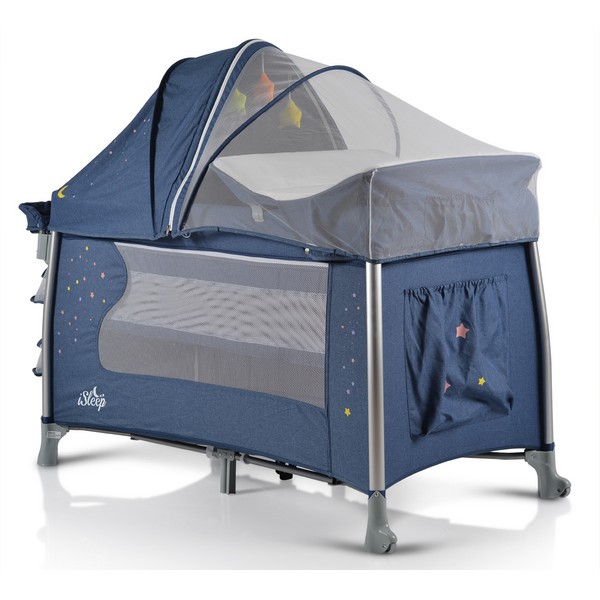 Кошарката ISleep разполага със странични джобове за играчки и аксесоари, както и със сенник с предпазваща мрежа против насекоми.