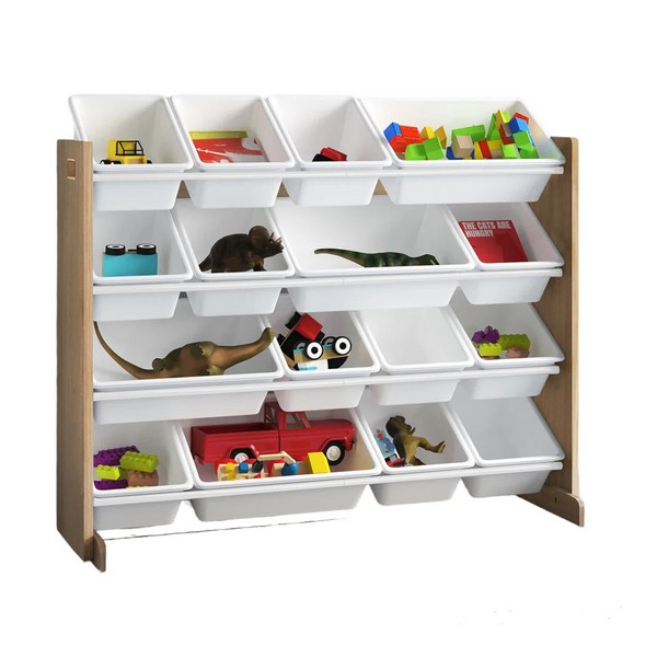 Органайзерът има 16 сменяеми пластмасови кутии за съхранение с различни размери - идеални за книги, играчки и принадлежности за рисуване.