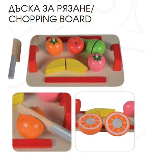 Комплектът за рязане включва няколко дървени части: дъска за рязане, ножче и 5 плодчета (ябълка, ягода, портокал, банан и круша).