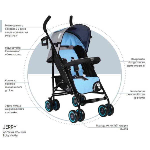 Красивата лятна количка Jerry е проектирана за мъници от 6-месечна до 36-месечна възраст или до достигането им на 15 килограма. Привлича със своя изключително свеж и модерен външен вид, а страхотните й функции я превръщат в един предпочитан модел за летните месеци. Бебешката количка има въртящи се колела, удобна дръжка, както и поставка за крачета, която се регулира. Този страхотен модел има голям сенник, който предпазва детенцето от пряка слънчева светлина и топлина. За да имате видимост към Вашето съкровище, върху него е разположено прозорче, а за да има къде да сложите необходимите Ви дребни аксесоари, има и джобче. Облегалката може да се регулира в няколко позиции, според нуждите и предпочитанията на Вашето мъниче. Сгъването и разгъването е много лесно и става за секунди, тип „чадър“. Бебешката количка се предлага в комплект с всички необходими модули и аксесоари: - 5-точков предпазен колан; - Регулираща се облегалка; - Поставка за крачетата; - Голям сенник с мрежесто прозорче; - Свалящ се предпазен борд; - Кош за покупки до 2 килограма.