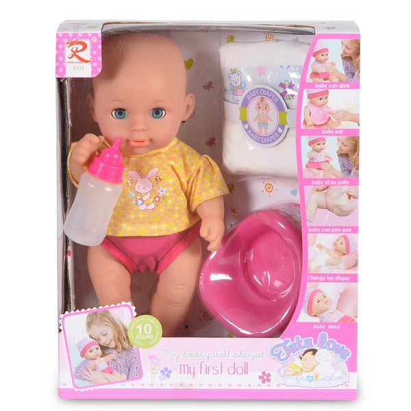 Куклата може да пие вода от шишенцето, включено в комплекта и след това да пишка.