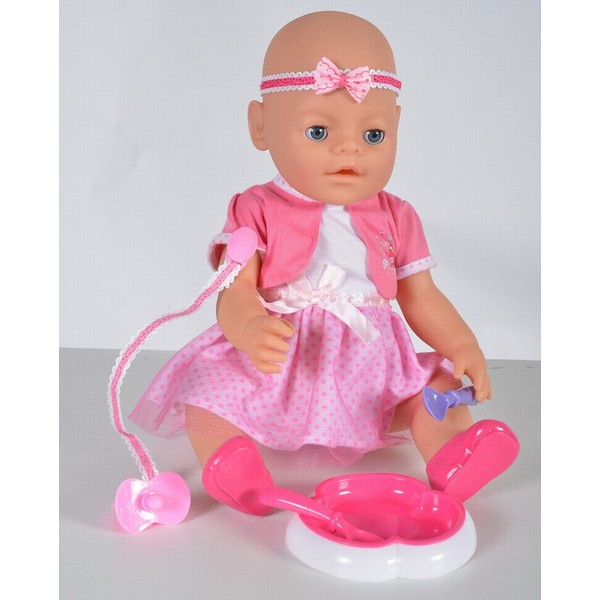 Куклата може да пие вода от шишенцето, включено в комплекта и след това да пишка.