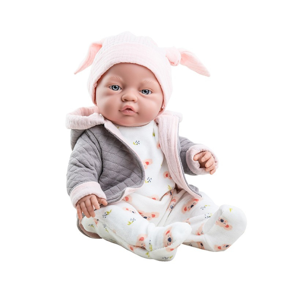 GS/05191Запознайте се с ръчно изработената кукла бебе Albornoz от серията Bebes на испанската фирма Paola Reina, която ще спечели сърцето на Вашето дете от първата минута. Играта с куклата ще стимулира развитието на визуалното възприятие, въображението и речта. Нежно парфюмирана, за още по реално усещане. Очите са изразителни и големи и са изработени от безопасна прозрачна пластмаса. Облечена е с бяло боди на коали, сив суитчър с качулка и сладка розова шапка с ушички.