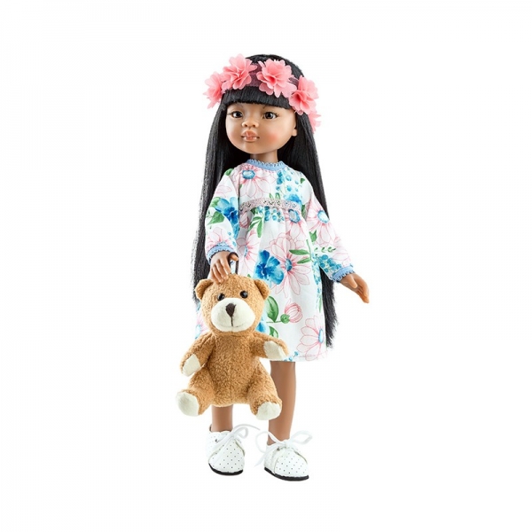 GS/04453Запознайте се с ръчно изработената кукла Meily от серията Las Amigas на испанската фирма Paola Reina, която ще спечели сърцето на Вашето дете от първата минута. Играта с куклата ще стимулира развитието на визуалното възприятие, въображението и речта. Ръцете, главата и краката се движат и така куклите могат да са в стоящо или седящо положение. Очите са изразителни и големи, не могат да се затварят и са изработени от безопасна прозрачна пластмаса. Косите изглеждат естествени и с блясък. Захващането им е много плътно и стабилно, което позволява лесното разресването и оформяне на прически. Meily е облечена с красива рокля с флорален мотив и сладки бели пантофки. В ръцете си държи любимата играчка - мече.